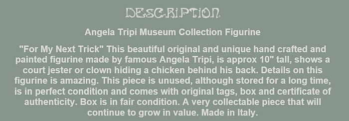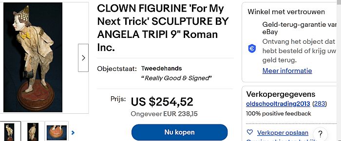 23cm high De foto's doen dit beeld geen recht (in het echt veel mooier) met kader met certificaat van authenticiteit For my next trick " gehandtekend op het beeld met originele doos kunstkenners kennen deze wereldberoemde artieste van haar (haast onbetaalbare) kerststallen Les photos ne rendent pas justice à cette image (beaucoup plus jolie en réalité) Avec certificat d'authenticité Pour mon prochain tour " Signé sur la statue Avec boîte d'origine Les connaisseurs d'art connaissent cette artiste de renommée mondiale grâce à ses crèches (presque inestimables) Die Fotos werden diesem Bild nicht gerecht (in Wirklichkeit viel schöner) Mit Echtheitszertifikat Für meinen nächsten Trick " Signiert auf der Statue Mit Originalverpackung Kunstkenner kennen die weltberühmte Künstlerin durch ihre (fast unbezahlbaren) Krippen |