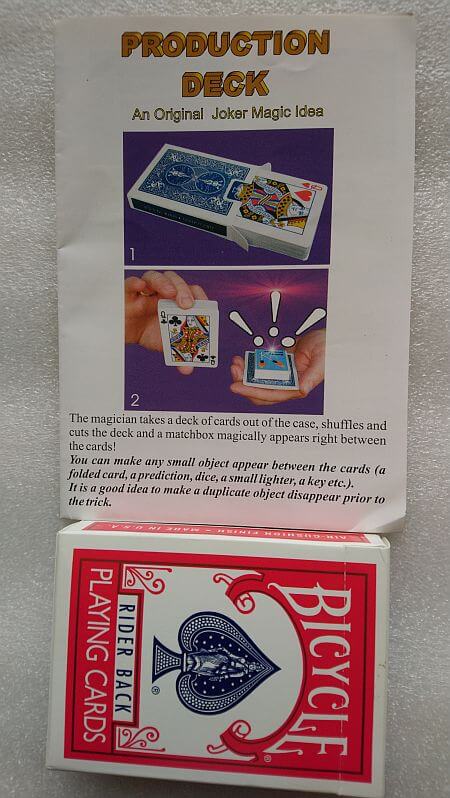 - Om een voorwerp (ter groote van een luciferdoosje) te laten verschijnen uit een deck. Zeer goed ! - Faire apparaître un objet (de la taille d'une boîte d'allumettes) à partir d'un deck. Très bien ! - Um einen Gegenstand (in der Größe einer Streichholzschachtel) aus einem Stapel erscheinen zu lassen. Sehr gut ! - To make an object (the size of a matchbox) appear from a deck. Very good! |